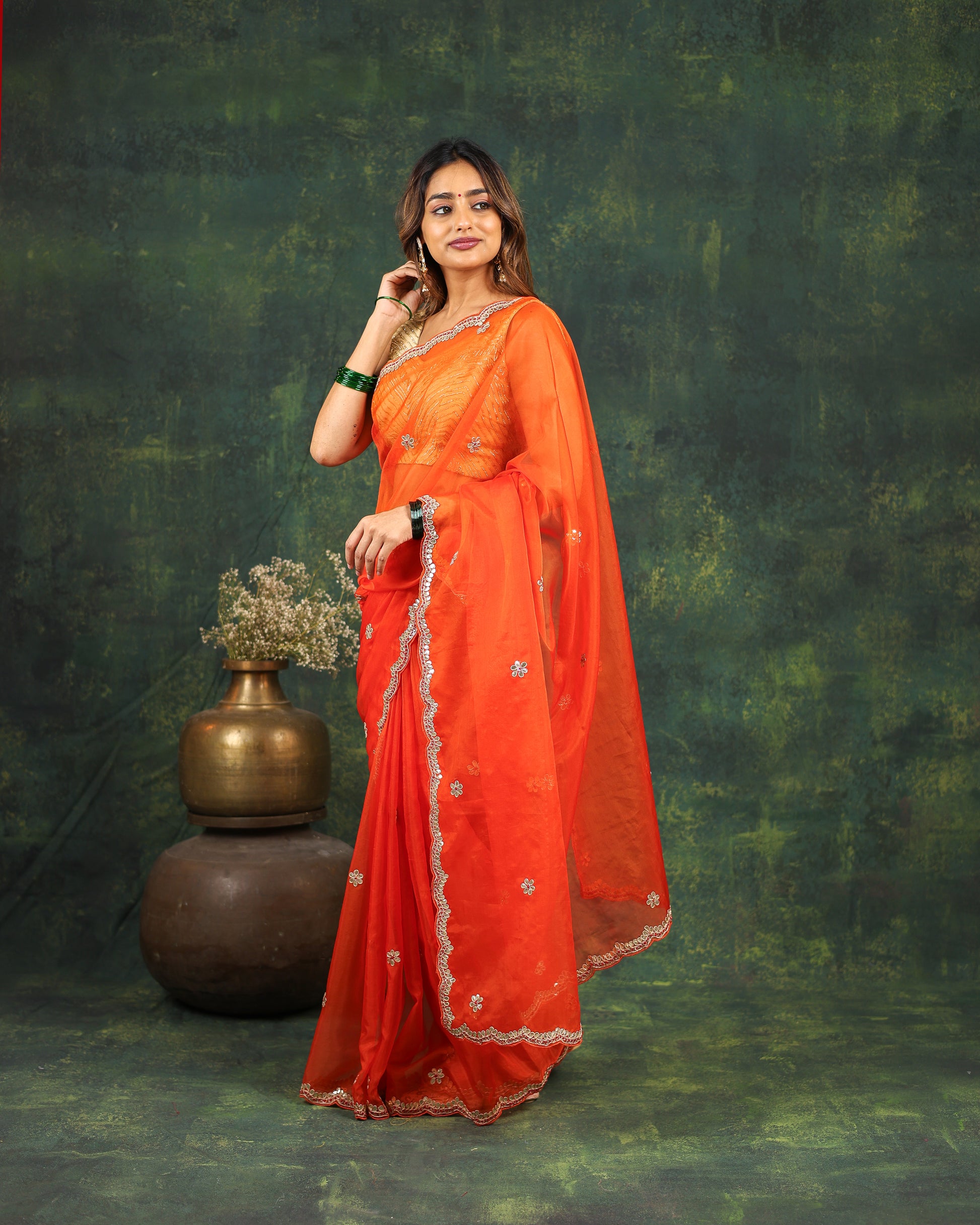 - Orange organza saree with sequins and zardosi threadwork